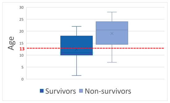 Age box-plot for age between survivors and non-survivors with the 13-year-old threshold in red dotted line.