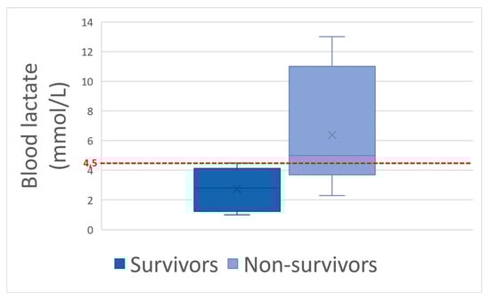 Blood lactates box-plot between survivors and non-survivors with the 4.5 mmol/L lactates threshold in red dotted line.