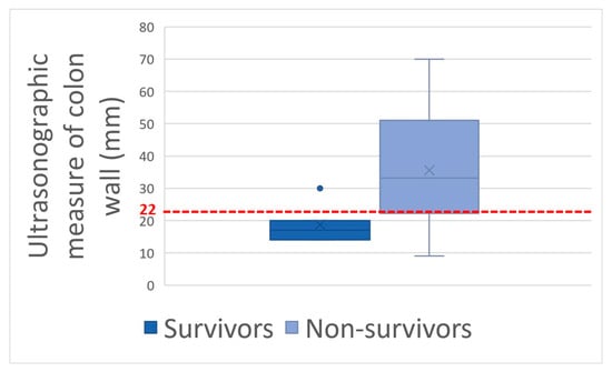 Colon wall thickening box-plot between survivors and non-survivors with the 22 mm thickening value threshold in red dotted line.