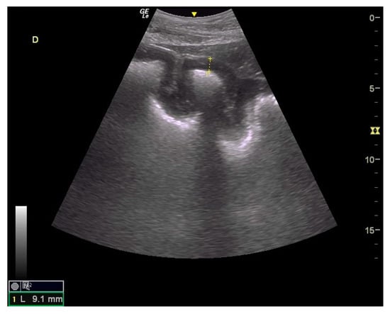Ultrasound images of large colon. Moderate to marked thickening of large colon with easily visible villosities; the yellow dote line indicates a measurement of the colon wall at 9.1 mm.