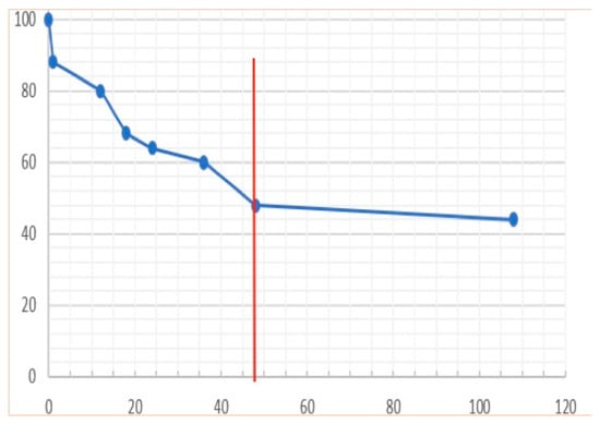 Proportion of horses still alive relative to duration of hospitalization (in hours); the red line marks the threshold of 48 h of hospitalization stay.