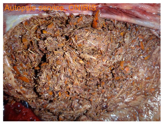 Post-mortem findings were available for five horses. A large amount of acorn husks (Figure 9) were observed in the intestinal tract of all horses (n = 5/5). Main lesions observed were an extensive severe edematous colitis in four of the five horses (Figure 10, Figure 11 and Figure 12). The cadaver of the last one was too putrefied for post-mortem examination. Extensive ulcers were present in two horses, while extensive hemorrhages appeared in two others. Other significant lesions included petechia, peritoneal or pleural effusion, renal congestion and adrenal hemorrhage.