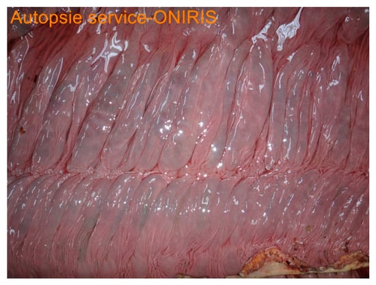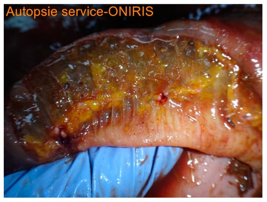 In addition to the marked seasonality, the clinical presentation was quite typical with an acute to fulminant severe edematous colitis leading to toxic shock, which was complicated in several cases with marked azotemia, increase hepatic or muscle enzymes, and intravascular hemolysis. Although not fully detailed in other studies, the hemato-biochemical results were similar to previous reports [,] and can be easily understood in view of the acute colitis shock. Abdominal ultrasonography examination revealed marked thickening of the large colon wall, especially in non-survivors with values rarely encountered in other diseases. The thickness was so severe that clear measurement was sometimes difficult (Figure 7). This reflects the severe colon edema as it could be observed post-mortem (Figure 11 and Figure 12).