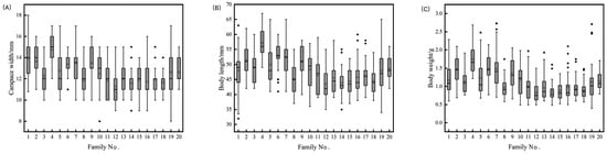 Box plot of growth-related traits of L. vannamei family (carapace width (A), body length (B), body weight (C)). Note: the maximum, minimum, and outliers are represented by “_”, “_”, and “◆”, respectively.