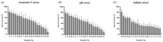 Survival of 20 families of L. vannamei (ammonia-N stress (A), pH stress (B), salinity stress (C)).