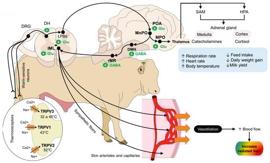 Neurophysiology of mammals under heat stress. The perception of noxious and non-noxious heat by peripheral thermoreceptors (TRP) triggers a series of electrical signals aiming to thermoregulate. Temperatures between 32 and 52 °C activate TRPV3, TRPV1, and TRPV2 ion channels. Warm-sensitive neurons transmit the thermal signaling into the DH, where the neurons synapse with the LPBd nucleus to start a physiological response against heat stress. After reaching the main thermoregulatory center (the POA, MnPO, and MPO), projections to the DMH, the rMR, and the IML activate the sympathetic fibers that innervate the skin arterioles and capillaries. The compensatory vasodilation response increases blood flow to, consequently, increase the amount of radiated heat through the skin to decrease body core temperature. Simultaneously, the connection of the MPO with the thalamus and sympathetic-mediated axis (SAM and HPA) causes the release of catecholamines and cortisol, which highly influence the physiological and behavioral mechanisms of thermoregulation in animals. DH: dorsal horn of the spinal cord; DMH: dorsomedial hypothalamus; DRG: dorsal root ganglion; HPA: hypothalamic–pituitary–adrenal axis; IML: intermediolateral laminae; LPBd: dorsal part of the parabrachial nucleus; MPOa: medial preoptic area; MnPO: median preoptic area; POA: preoptic area; rMR: rostral medullary raphe; SAM: symptom-adrenomedullary axis; TRP: transient receptor potential.