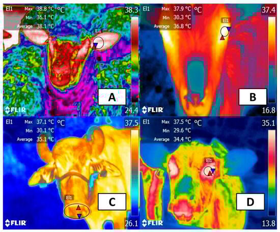 Vasomotor response is one of the compensatory mechanisms used by most animals because modifying the diameter of the peripheral vessels closest to the skin dissipates heat by promoting a greater thermal exchange with the environment [47]. This was studied in buffaloes during transport by our team in Rodríguez-Gonzáles et al. [48], where IRT was used to evaluate the surface temperature in different body areas. We found an increase of up to 5 °C in the surface temperature of the pelvic limbs after transport. Likewise, the temperature of the parietal-frontal region increased by up to 10 °C after mobilization. These authors explain that the increase in surface temperature might be due to transport being a known stressor for farm animals. Moreover, this study showed that regions with a significant blood supply facilitate the elimination of heat to regulate body temperature. Something similar has been reported in camels, in whom increases in the surface temperature of the axilla, flanks, and hump were directly correlated with the rate of sweating due to high environmental temperature [49]. Other examples have been reported in pigs, in which sows exposed to noncooled pens (air temperature of 25.6 °C) had the highest temperature in the mammary gland (35.9 °C), a value that differed from that in sows kept under cooler pens (air temperature of 23.3 °C) [50]. These studies suggest that, for animals exposed to HS, vasomotor response is an important mechanism for heat elimination and that peripheral thermal response depends on the body region where it is evaluated [23,51]. Figure 2 shows the thermal response obtained by the authors of the present review from healthy farm species.
