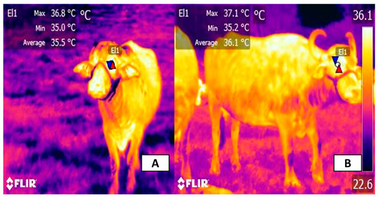 Effect of solar radiation on the surface temperature of the periocular region of water buffaloes. (A) Morning eye temperature. The surface temperature of the periocular region (El1) in the morning has a maximum value of 36.8 °C, while the average and minimum temperatures are 35.5 and 35 °C. (B) Eye temperature at midday. In comparison with the temperature shown in the morning, the maximum temperature increased by 0.3 °C, the average temperature increased by 0.2 °C, and the minimum temperature decreased by 0.6 °C (El1), which is possibly due to the solar radiation during the time of the day, where animals are most susceptible to HS. Red triangles represent the maximum temperatures of the thermal windows. Blue triangles represent the minimum temperatures of the region of interest. FLIR thermal camera, model E60, lens FOL 18 mm, IR resolution 320 × 240.