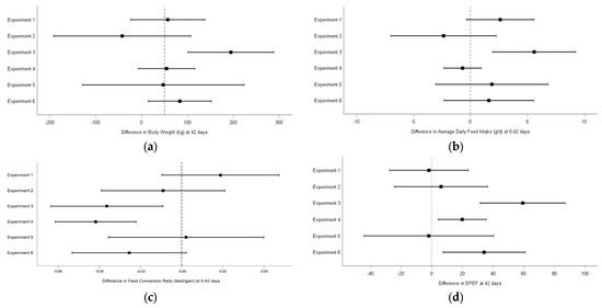Effect sizes with 95% confidence intervals between BVA and Control treatments for body weight at 42 days (a), average daily feed intake at 0–42 days (b), feed conversion ratio at 0–42 days (c), and EPEF at 42 days (d).