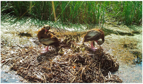 A breeding pair of black-bellied whistling ducks (Dendrocygna autumalis) and its brood standing on top of a flooded American alligator (Alligator mississippiensis) nest in coastal South Carolina, 2017. Both adult ducks are preening.