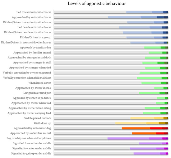 Horses respond to threats by moving away or, if that is not an option, by behaving in ways that deter the threat or move it away. These responses that help to reduce the threat are regularly labelled aggression, but this overlooks the motivation that underpins the responses which are often simply forms of defence. A catch-all term that avoids the need to interpret the motivation for defence and aggression responses is agonistic behaviour. In domestic horses, all such responses are important because they can be dangerous for both horses and personnel; they can prompt humans to defend themselves and can compromise the relationships that horses have with their carers. This study used an online questionnaire to ask owners about the management, training, and behaviour of the horses in their care. Although this questionnaire included data on horses that had not yet been trained to be ridden or had retired, this article focuses on the results of 2743 ridden horses. It reports a scale from warning signs—threatening to bite, pinning ears, tail swishing, threatening to kick or strike—to the most serious actions that include actual biting, kicking, or striking. The analysis revealed that agonistic behaviour is associated with certain management or training activities and that horses that show one form of behaviour are likely to show others in the same context. This means that some horses are particularly motivated to show these responses by certain triggers that arise in such contexts. The clusters with common characteristics were those observed in the context of: accelerating when ridden; saddling; familiar management activities; proximity to unfamiliar horses and other species. Taken together, these results highlight the prospect that the motivation to show these responses differs with context. This finding challenges the simplistic view that the problems with equine aggression and defence lie with the horses themselves rather than with historic or current management practices.