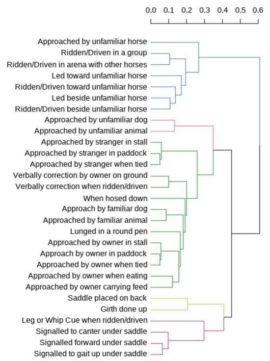 Hierarchical cluster dendrogram for the reported aggression scores of the ridden horses showing five clusters (coloured blue, red, green, yellow, and purple) within the structure of the dissimilarity matrix for the 29 potential aggression triggers. The clusters reveal horses whose thresholds for agonistic behaviour vary with: intra-specific threats (blue); inter-specific threats (red); extraneous disturbances in a familiar environment (green); saddling-up (yellow); and locomotory effort (purple).