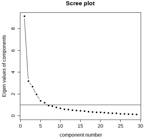 Parallel analysis suggested the extraction of six components, which was consistent with the scree plot (see Figure 3) and Kaiser rule.