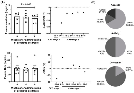Chicago/Turabian StyleTsai, Ching-Wen, Hsiao-Wen Huang, Ya-Jane Lee, and Ming-Ju Chen. 2024. "Investigating the Efficacy of Kidney-Protective Lactobacillus Mixture-Containing Pet Treats in Feline Chronic Kidney Disease and Its Possible Mechanism" Animals 14, no. 4: 630. https://doi.org/10.3390/ani14040630