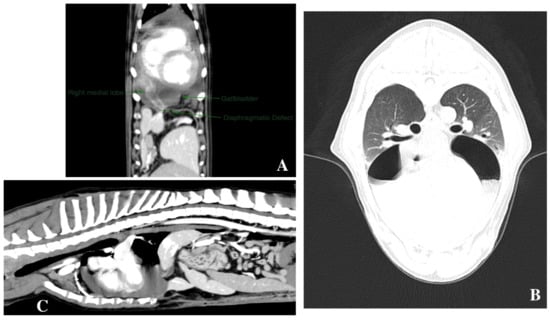 - Evans, S.M.; Biery, D.N. congenital peritoneo pericardial diaphragmatic hernia in the dog and cat: A literature review and 17 additional case histories. Am. Coll. Vet. Med. 1980, 3, 108–116. [Google Scholar]