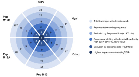 The main toxins secreted by Eulalia sp., after being identified by Rodrigo et al. [21], were analyzed and narrowed down to one target transcript per toxin, as follows: cysteine-rich secretory protein or phyllotoxin (Crisp), hyaluronidase (Hyal), serine protease (SePr), peptidase M12A (PepM12A), peptidase M13 (PepM13), and peptidase M12B (PepM12B). The target transcripts were identified according to complete predicted coding sequence, sequence size, expression value, and homology matching, with their use for biotechnological purposes as the main goal (Figure 1).