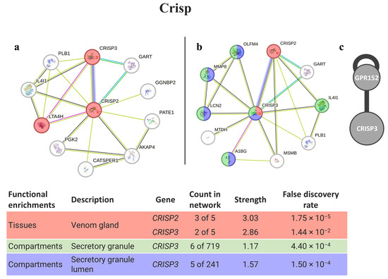 Matching the phyllotoxin (Crisp) with potential human homologs identified CRISP3 and CRISP2 as the best matches (Figure 2). Both proteins may interact with themselves, and some variants can be found in the venom glands of animals. Moreover, several proteins from the CRISP3 network are present in secretory granules.
