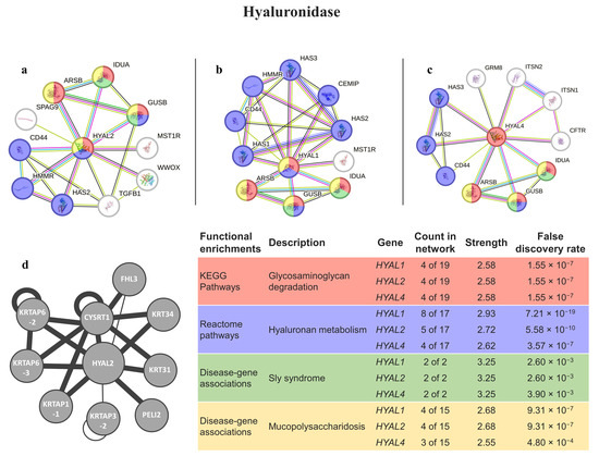 Hyal interaction pathways for the best homologs matches in humans. (a) Protein–protein interaction network obtained by STRING software for HYAL2; (b) protein–protein interaction network obtained by STRING software for HYAL1; (c) protein–protein interaction network obtained by STRING software for HYAL4; (d) human interactome from the HuRI for HYAL2. The confidence cut-off for showing interaction links was set to medium (0.400). ARSB—arylsulfatase B; CEMIP—cell-migration-inducing and hyaluronan-binding protein; CD44—CD44 antigen; CFTR—cystic fibrosis transmembrane conductance regulator; CYSRT1—cysteine-rich tail 1; FHL3—four-and-a-half LIM Domains 3; GRM8—metabotropic glutamate receptor 8; GUSB—beta-glucuronidase; HAS1—hyaluronan synthase 1; HAS2—hyaluronan synthase 2; HAS3—hyaluronan synthase 3; HMMR—hyaluronan-mediated motility receptor; HYAL1—hyaluronidase-1; HYAL2—hyaluronidase-2; HYAL4—hyaluronidase-4; IDUA—alpha-L-iduronidase; ITSN1—intersectin-1; ITSN2—intersectin-2; KRT31—keratin 31; KRT34—keratin 34; KRTAP3-2—keratin-associated protein 3-2; KRTAP1-1—keratin-associated protein 1-1; KRTAP6-2—keratin-associated protein 6-2; KRTAP6-3—keratin-associated protein 6-3; MST1R—macrophage-stimulating protein receptor alpha chain; PELI2—E3 ubiquitin-protein ligase pellino homolog 2; SPAG9—C-Jun-amino-terminal kinase-interacting protein 4; TGFB1—transforming growth factor beta-1 proprotein; WWOX—WW domain-containing oxidoreductase.