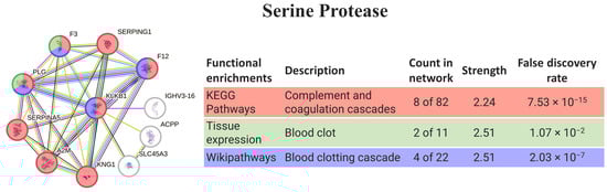 The human homolog of serine protease (KLKB1) is directly involved in the immune complement, coagulation, and blood-clotting cascades (8 of 11 proteins). In fact, the biological processes more relevant to the pathway are related to coagulation, and a few are related to lectin pathways, thus they are connected with the defense mechanism (Figure 4).