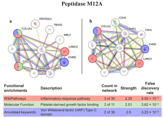 PepM12A interaction pathways for the best homolog matches in humans. (a) Protein–protein interaction network obtained by STRING software for TLL1; (b) protein–protein interaction network obtained by STRING software for TLL2. The confidence cut-off for showing interaction links was set to medium (0.400). BMP1—bone morphogenetic protein 1; CHRD—chordin; COL1A1—collagen alpha-1(I) chain; COL1A2—collagen alpha-2(I) chain; COL27A1—collagen alpha-1(XXVII) chain; CSH1—chorionic somatomammotropin hormone 1; CSH2—chorionic somatomammotropin hormone 2; LAMA3—laminin subunit alpha-3; LAMA4—laminin subunit alpha-4; LAMC2—laminin subunit gamma-2; MBL2—mannose-binding protein C; PCOLCE—procollagen C-endopeptidase enhancer 1; PRTFDC1—phosphoribosyltransferase domain-containing protein 1; TBX20—T-box transcription factor TBX20; TLL1—tolloid-like protein 1; TLL2—tolloid-like protein 2.