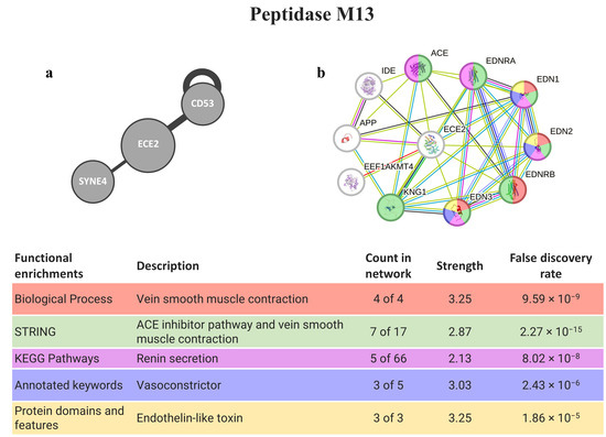 PepM13 interaction pathways for the best homolog matches in humans. (a) Human interactome from HuRI for ECE2; (b) protein–protein interaction network obtained by STRING software for ECE2. The confidence cut-off for showing interaction links was set to medium (0.400). ACE—angiotensin-converting enzyme, soluble form; APP—gamma-secretase C-terminal fragment 50; CD53—leukocyte surface antigen CD53; ECE2—endothelin-converting enzyme 2; EDN1—endothelin-1; EDN2—endothelin-2; EDN3—endothelin-3; EDNRA—endothelin receptor type a; EDNRB—endothelin receptor type B; EEF1AKMT4—EEF1A lysine methyltransferase 4; IDE—insulin-degrading enzyme; KNG1—kininogen-1; SYNE4—nesprin-4.