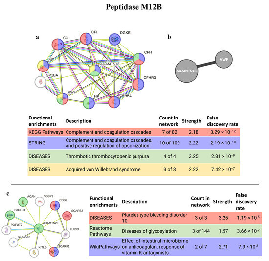 PepM12B interaction pathways for the best homolog matches in humans. (a) Protein–protein interaction network obtained by STRING software for ADAMTS13; (b) human interactome from the HuRI for ADAMTS13; (c) protein–protein interaction network obtained by STRING software for ADAMTS20. The confidence cut-off for showing interaction links was set to medium (0.400). ACAN—aggrecan core protein 2; ADAMTS13—disintegrin and metalloproteinase with thrombospondin motifs 13; ADAMTS20—disintegrin and metalloproteinase with thrombospondin motifs 20; ADAMTSL2—ADAMTS-like protein 2; B3GLCT—beta-1,3-glucosyltransferase; C3—complement C3c alpha’ chain fragment 1; CD36—leukocyte surface antigen; CFI—complement factor I heavy chain; CFH—complement factor H; CFHR1—complement factor H-related protein 1; CFHR3—complement factor H-related protein 3; DGKE—diacylglycerol kinase epsilon; FURIN—Furin; F8—factor VIIIa heavy chain, 200 kDa isoform; GP1BA—platelet glycoprotein Ib alpha chain; HP—haptoglobin alpha chain; KITLG—soluble KIT ligand; POFUT2—GDP-fucose protein O-fructosyltransferases 2; SCARB1—scavenger receptor class B member 1; SCARB2—scavenger receptor class B member 2; SLC45A2—membrane-associated transporter protein; SSBP2—single-stranded DNA binding protein 2; VWF—Von Willebrand factor.