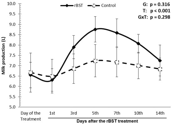 The use of rbST makes it possible to direct nutrients to the mammary gland through the action of IGF-I, providing an increase in daily milk production and also an increase in total lactation production [21]. It was verified that there was a significant increase in the amount of milk produced in animals that received rbST, regardless of the use of this hormone for short or long periods [7,22].