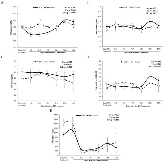 In the early days after the use of rbST, a decrease in milk protein content was observed, and on the third day, it was found that the milk protein values in the treated group (3.59 ± 0.06 g/dL) were significantly lower than those observed in the control group (3.89 ± 0.06 g/dL). A statistically significant difference was found between the groups on the third day (p < 0.0001). From the fifth day after the start of hormone treatment, protein values began to oscillate without any statistical difference between the treated and control groups (Figure 2A).