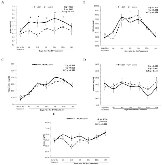 Influence of the use of recombinant bovine somatotropin (rbST) on the lipidogram and plasmatic glucose concentrations of Murrah buffaloes: (A) β-HBO serum levels; (B) NEFA serum levels; (C) triglyceride serum levels; (D) cholesterol serum levels; (E) plasmatic glucose concentrations. * presence of signal denotes the presence of statistical differences between groups.