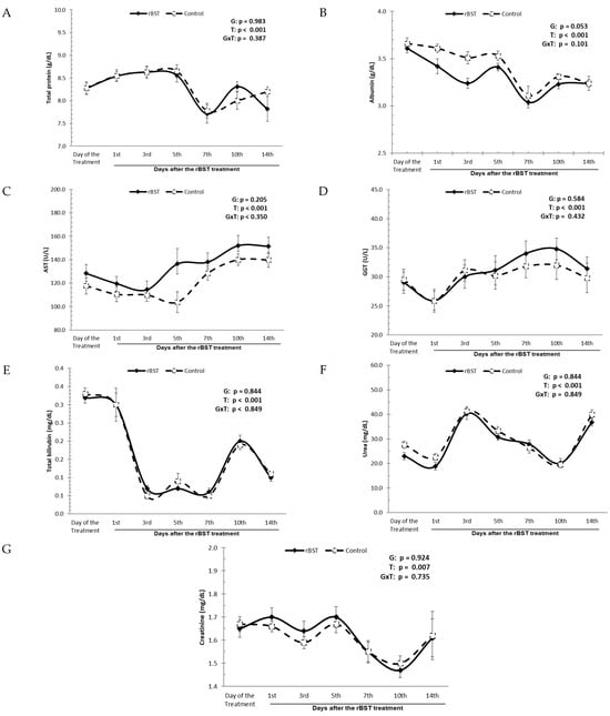 Influence of the use of recombinant bovine somatotropin (rbST) on the liver and renal function of Murrah buffaloes. (A) Total protein serum levels; (B) albumin serum levels; (C) AST serum levels; (D) GGT serum levels; (E) total bilirubin serum levels; (F) urea serum levels; (G) creatinine serum levels.