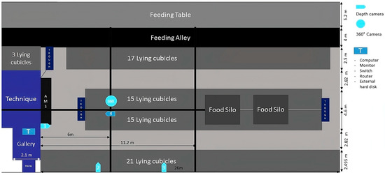 In an initial investigation, parameters that can be automatically detected by computer vision have been identified [17]. During a direct observation on 20 April 2023, the practicability of some of these parameters was evaluated in the research barn. For this purpose, the number of cows eating, lying (in the cubicles and in the alley) and standing (in the alley or cubicles), as well as walking animals and the use of the automatic milking system, were counted every 10 min. The parameters and the monitoring frequency of 10 min turned out to be sufficient and were chosen for the subsequent study period. It continued recording for two weeks, resulting in 2299 snapshots, but 690 were discarded due to poor image resolution at night.