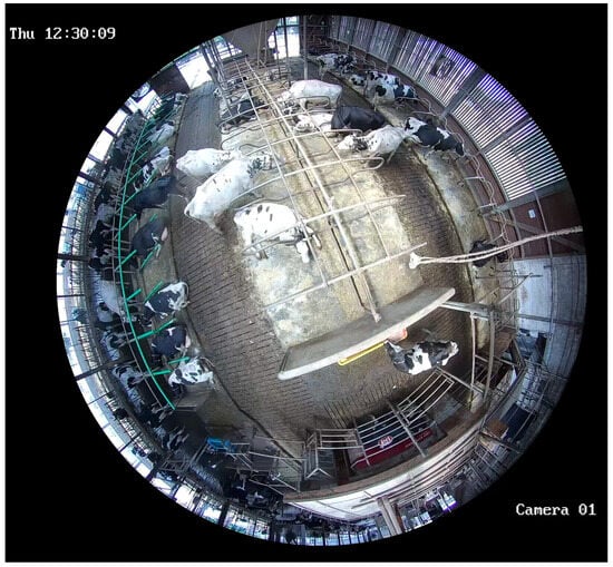 The objectives of this research were to (1) describe the dairy cows’ behaviour in a free-stall barn with an automatic milking system and (2) show the potential of a single 360° camera as a low-budget vision-based application. In order to address these research objectives, we evaluated snapshots of a 360° fisheye camera over a duration of 14 days. This research is part of the smartMILC project. The aim of the project is to develop a holistic system for the evaluation of animal health and welfare on the basis of a digital twin [16].