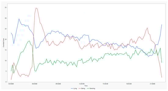 The basis for the following data analysis is 1609 snapshots. Only the time period from 4 a.m. to 10 p.m. was evaluated, as the quality of the night images does not allow a reliable count of animals. Thus, a complete assessment of the circadian rhythm is not possible from our set of data. Nevertheless, the animals in the barn showed a diurnal rhythm (Figure 3). Especially shortly before feeding time, many animals were waiting in the walkway of the feeding table. When the feed is presented, the number of standing and lying animals decreases. Between 8 a.m. and 7 p.m., there is little fluctuation in the behavioural patterns. As the second feeding takes place 4 h after the first feed presentation, the animals are less motivated to go to the feed table again. Around 7 p.m., the number of eating animals reaches another peak but then decreases again.