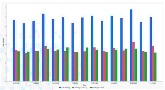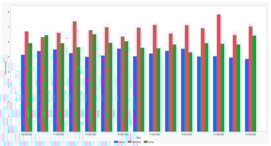 During an observation period of 18 h per day, the average lying time per cow was 5.9 h, the average standing time was 6.9 h, and the average feeding time was 5.2 h (Figure 4).