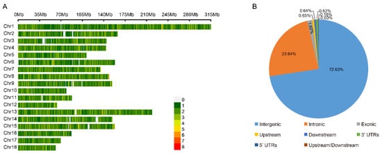 We compared the phenotypical features of the lowland Tibetan pigs that have inhabited a low-altitude region (500 m) for nearly 20 generations with those of the highland Tibetan pigs that inhabit a high-altitude region (4000 m). In terms of appearance, we found that the lowland Tibetan pigs have less hair on their bodies when compared with the highland Tibetan pigs (Figure 1A). Due to the poor ability of the pig to dissipate heat, thick hair can intensify the adverse impacts of high temperatures in low-altitude regions, potentially resulting in heat stress. Therefore, a reduction in hair on their body surface may represent an adaptive change of lowland Tibetan pigs to their lowland habitat. Furthermore, compared with the highland Tibetan pigs, the lowland Tibetan pigs had higher back fat thickness (median 14 vs. 18 mm) and higher average daily weight gain (median 159 vs. 229 g/pig per day) with p-values < 2.2 × 10−16 according to unpaired two-tailed Student’s t-tests (Figure 1B,C). This finding confirms that artificial selection is an important method for improving the productive performance of Tibetan pigs. To investigate genotypic differences between the 100 highland and 49 lowland Tibetan pigs, they were successfully genotyped using Zhongxin-1 Porcine Breeding Array PLUS chips. A total of 45,212 SNPs were identified, and after applying the QC filters (see the Materials and Methods section for details), we obtained 18,254 autosomal SNPs for further analysis. These SNPs were evenly distributed across their chromosomes (Figure 2A), and most of them were located in intronic (n = 4316, 23.64%) or intergenic (n = 13,258, 72.63%) regions (Figure 2B). The number of identified SNPs was less than the numbers identified in previous comparisons between the highland Tibetan pigs and the lowland Chinese indigenous pig breeds [,]. Two main explanations for this discrepancy are possible. First, we used chips for the SNP genotyping, which may have missed SNPs that were detected by whole-genome sequencing. Nevertheless, previous studies have shown that the Zhongxin-1 Porcine Breeding Array PLUS chip provided reliable estimates of genomic diversity and selection signatures in a comparative analysis between pig breeds []. Second, low-altitude Chinese indigenous pig breeds have considerable phenotype diversity due to the thousands of years of domestication and are therefore more genetically differentiated than the high-altitude Tibetan pigs. Importantly, the low-altitude Tibetan pigs used in this study have only experienced domestication and artificial selection in lowland regions for approximately 20 generations, and therefore, there is relatively little genetic difference between them and the high-altitude Tibetan pigs.