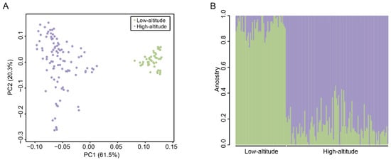 Population structure of 149 Tibetan pigs. (A) The PCA plots of the high-altitude (purple) and low-altitude (green) samples based on the genotyped SNPs. (B) Population structure inferred by Admixture analysis based on identified SNPs. The different colors indicate different ancestral populations. Each small vertical line represents an individual.