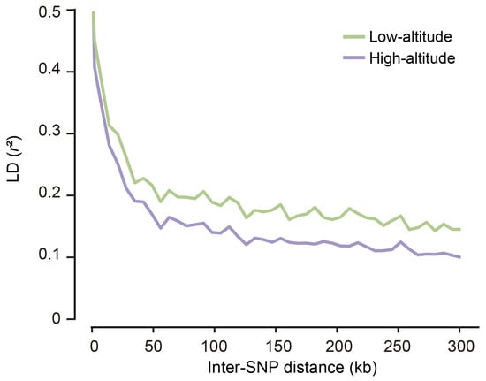 Linkage disequilibrium (LD) values for each population were calculated for 100 kb windows based on the squared correlation coefficient (r2) between each pair of SNPs using PopLDdecay (v3.4) software [] with default parameters. The decay of LD with physical distance between SNPs was visualized using PopLDdecay [].