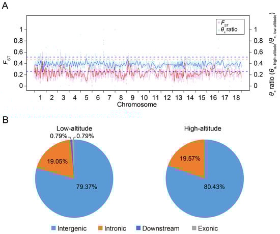 Distribution of putatively selective signatures in the high-altitude and low-altitude Tibetan pigs on the 18 autosome chromosomes. (A) The FST values and θπ ratios (θπ,highland/θπ,lowland) across the pig genome. The FST values and θπ ratios were scaled by min–max normalization. The pink and light blue points represent the FST values and θπ ratio for the genomic regions, respectively. The red and blue lines are the trend lines for the FST values and θπ ratio, respectively. The red dashed line represents the top 1% rank value of FST values, while the blue dashed lines represent the top and bottom 1% values of θπ ratios (θπ,highland/θπ,lowland), respectively. (B) Distribution of candidate SNPs in high-altitude and low-altitude Tibetan pigs in different genomic elements in the pig genome. ‘Downstream’ regions were defined as the 1 kb region of the gene end site.