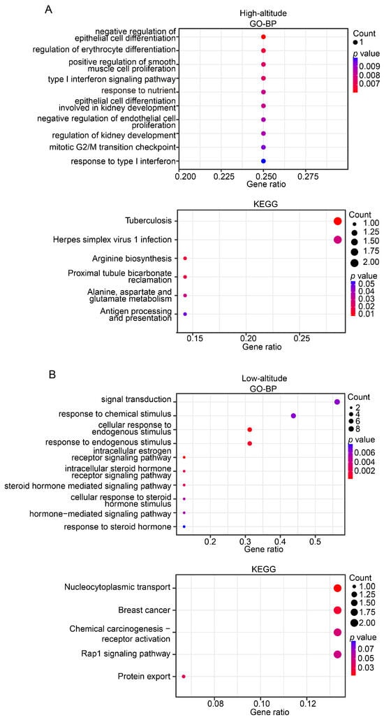 Functional enrichment for identified candidate genes in high-altitude (A) and low-altitude (B) Tibetan pigs. Plot showing the most statistically significant (up to 10) GO terms (upper panel) and KEGG pathways (bottom panel). Dot size indicates the gene number, and the dot color represents the p value. The x-axis represents the proportion of identified candidate genes for a given GO term or KEGG pathway.