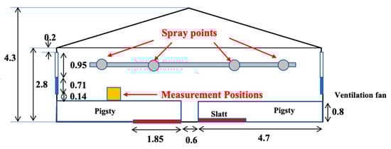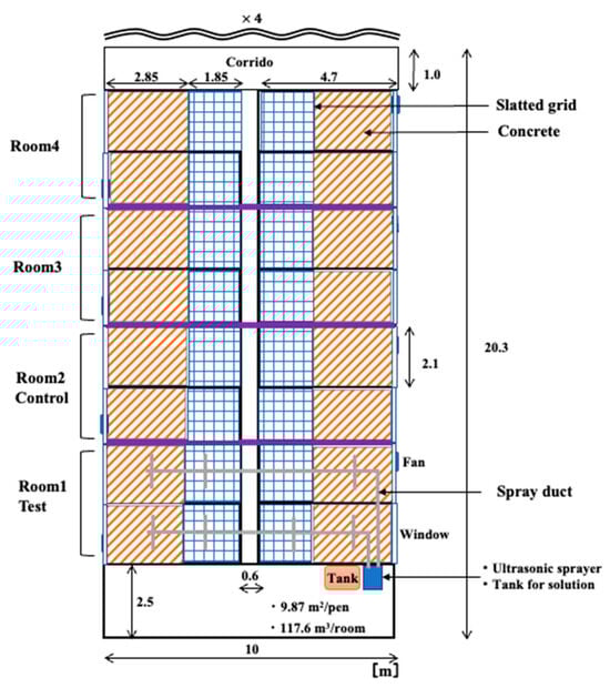 The research was conducted in an integrated operation with 200 sows in Fukushima Prefecture, Japan. The weaning piggery has a ventilation system, with a total of four rooms and four pens per room. The volume of each room was 117.6 m3, and the area of the pen was 9.87 m2. The floor of the stalls was made of concrete and slatted flooring, and each room was equipped with two ventilation fans and an inverter controlled by temperature. When the research began, the experimental group comprised 80 pigs, and the control group consisted of 88 pigs, with both groups being 49 days old. Figure 1 and Figure 2 show the plan view of the inside of the experimental farm and the measurement and spray points.