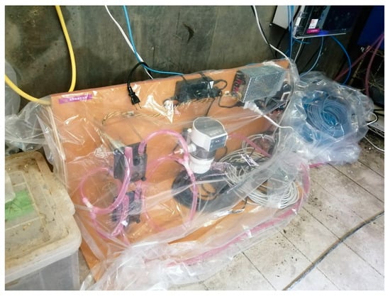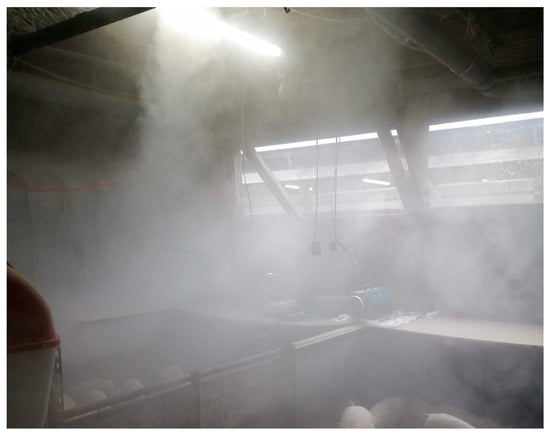 Continuous spraying was conducted as the spraying and interval times were implemented, with intervals meticulously set at 10 min increments. Whenever the relative humidity within the facility exceeded 80%, the spray was stopped to avert potential adverse repercussions on the weaning pigs. Furthermore, a comparative analysis was undertaken, setting specific areas as the test and control regions, encompassing four pig stalls within a single enclosure. The whole system is illustrated in Figure 3, and a photograph of the equipment is in Figure 4. Nanobubble ozone water, demonstrated to be non-harmful to mammals in experimental studies and exhibiting a high bactericidal effect, was chosen as the spray solution. This solution was produced in the spraying system. The solution was spread from a height of 2.6 m below the ceiling using an ultrasonic sprayer, which produces particles with diameters ranging from 5 to 10 μm. This method was selected to ensure that the particles remain suspended in the air for an extended period. Additionally, this approach is more cost-effective compared to conventional nozzles. Precise control over the spray regimen was maintained by factoring in time, humidity levels, and aerosol concentrations. Figure 5 shows an image during spraying.