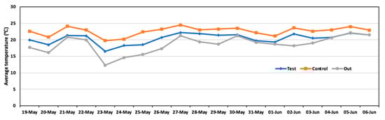 Daily average temperature in the test area, control area, and outside during the experiment.