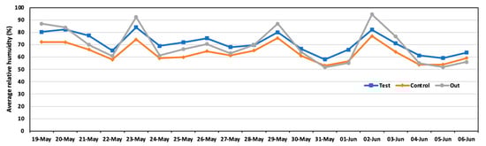 Daily average relative humidity in the test area, control area, and outside during the experiment.