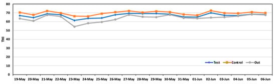 The temperature humidity index (THI), which is a measure used to assess the combined effects of temperature and humidity on animals, particularly livestock, is in Figure 8. The THI is crucial for evaluating environmental stress, such as heat stress, which can significantly impact animal welfare and productivity. The average THI during the experiment was 66.9 in the test area and 69.7 in the control area.