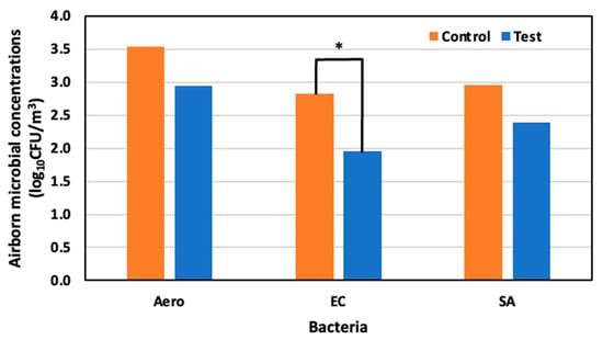 Airborne microbial concentration in the control and test area on day 4 at 52 days old; *: p < 0.05.