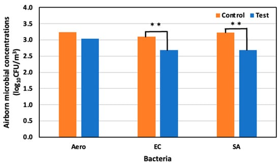 Airborne microbial concentration in the control and test areas on day 11 at 59 days old; **: p < 0.01.
