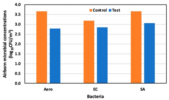 Therefore, the test area exhibited substantial mitigation of airborne microbial concentrations, especially of E. Coli and S. aureus, with reductions reaching as high as 85.7% and 69.5%, respectively, compared to the control area.