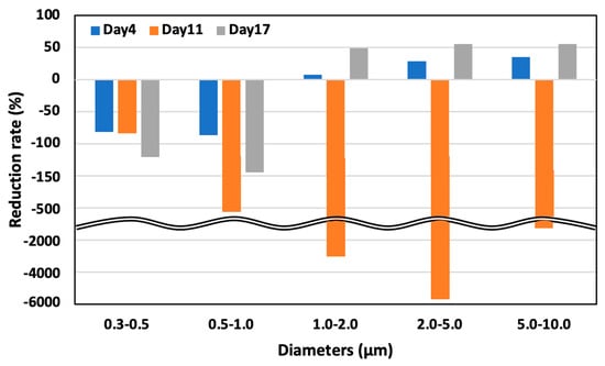 The aerosol mass concentration was reduced for the test area compared to the control area on every experiment day. The average aerosol mass concentration was reduced by more than 50% in the test area compared to the control area, indicating that spraying the ozone water effectively reduced the aerosol mass concentration. Figure 16 shows the reduction rate of aerosol mass concentration in the test and control areas on days 4, 11, and 17.