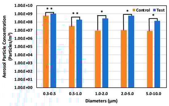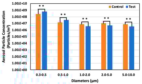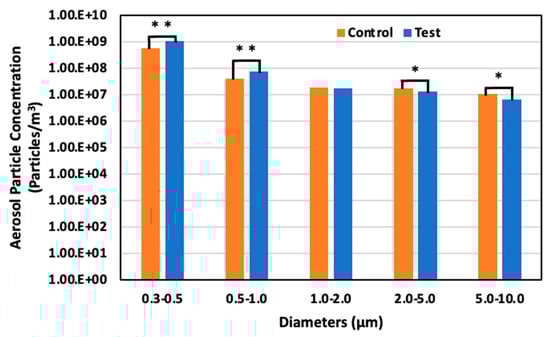 Aerosol particle concentration in the control and test areas on day 11 at 59 days old; *: p < 0.05; **: p < 0.01.
