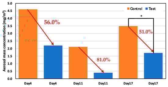 Aerosol mass concentration in the control and test areas on days 4, 11, and 17; *: p < 0.05.